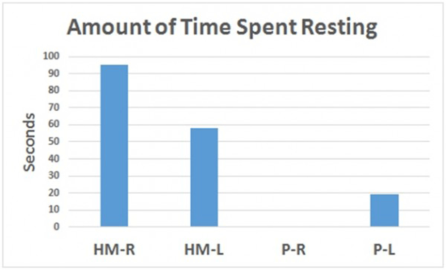 Figure 6. The amount of time that a participant spent resting during 5 minute exercise sessions with the HandMentor on their right arm (HM-R), Hand-Mentor on left arm (HM-L), prototype on right (P-R), and prototype on left (P-L).