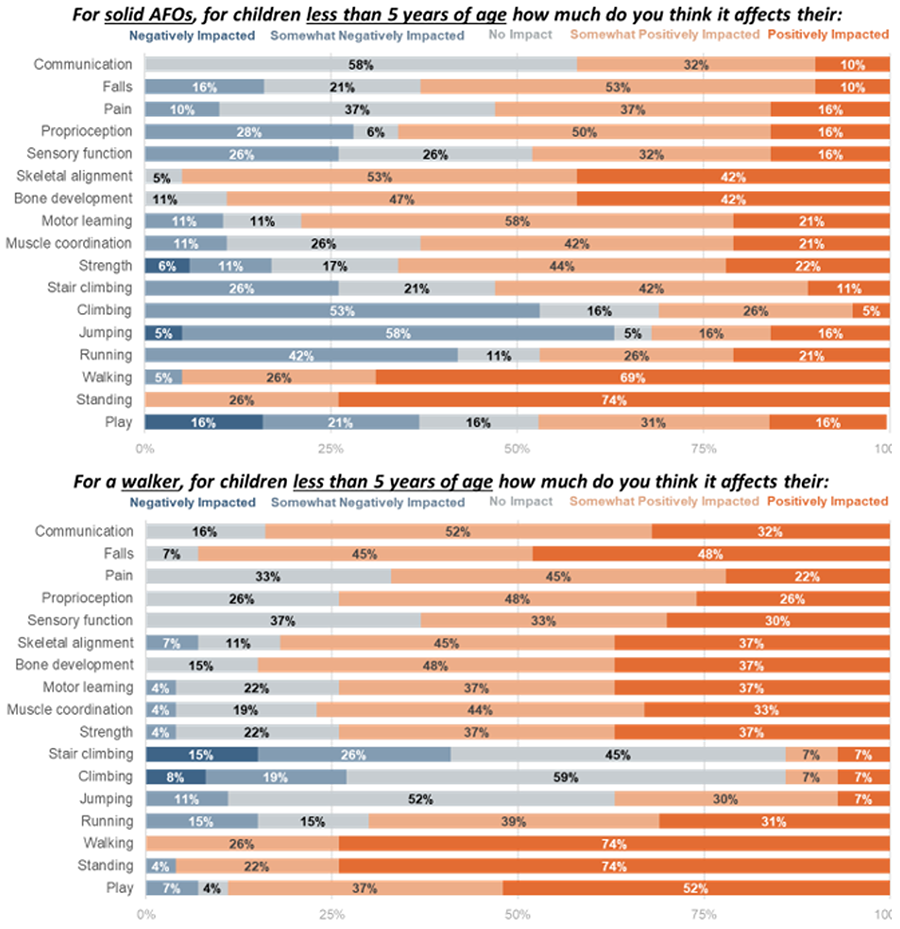 Meanwhile, clinicians specifically highlighted that while AFOs were seen to positively impact walking, standing, skeletal alignment, and bone development they were seen as barriers to climbing, running, jumping, and play (Figure 1). While walkers were seen as positively impacting walking, standing, play, and falls they presented barriers to stair climbing and jumping. Only 4 and 6 clinicians respectively responded about the impacts of hinged AFOs and SMOs, so they are not included in Figure 1.