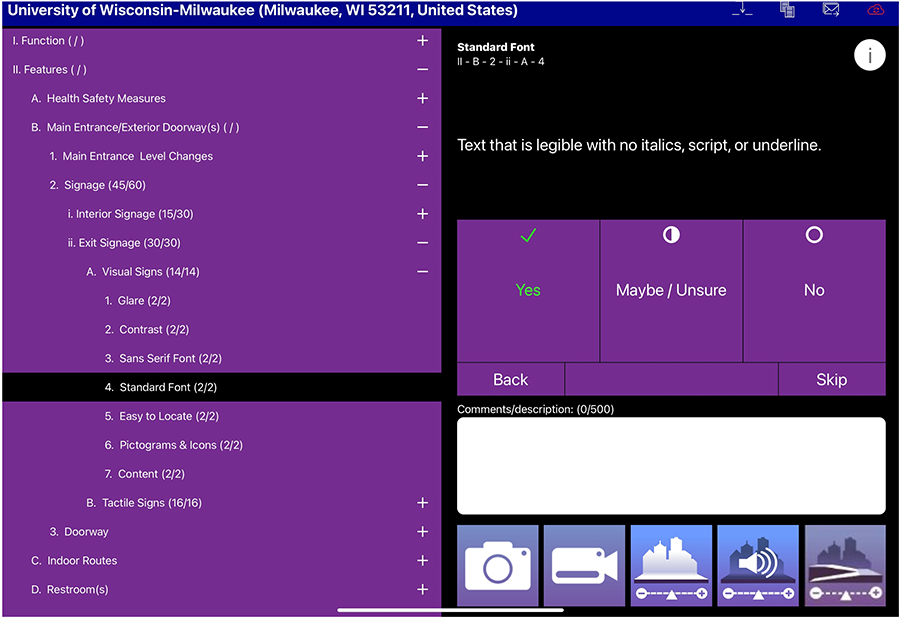 A functional myAccessTools protype (Figure3) was developed by the R2D2 Center at UW-Milwaukee. The app consists of a total of 2,915 items divvied between two sections, functions and features. The functions portion contains 120 items, and the features group contains 2,795 items. Both function and feature sections each consist of four elements: Health Safety Measures, Main Entrance(s)/Exterior Doorway(s), Indoor Routes and Restroom(s). Health Safety Measures has 58 items and Main Entrances(s)/Exterior Doorway(s) possesses 413 items. The total number of items for Indoor Routes is 1,817 and Restroom(s) has 627 items. Each item consists of a formulated item description that is clear enough for all users to accurately rate items and possess the Yes, Maybe/Unsure and No scoring options.