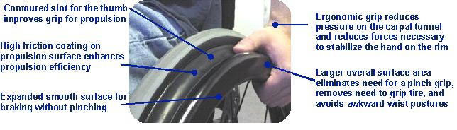 The Natural-Fit is an ergonomic wheelchair handrim brought to market in 2003. The Natural-Fit is an assembly of two separately coated components, a smooth oval surface for the palm of the hand and a higher friction contoured slot for the thumb. The assembly of these two components creates an ergonomic grip for the hand and provides separate surfaces for propulsion and braking (See Figure 1).