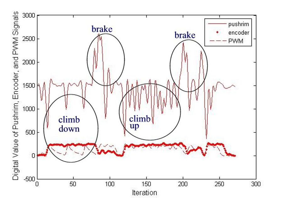 The power-assist control algorithm was tested and worked to specification. Figure 2 plots the pushrim torque signals, wheel speed signals from encoders, and PWM signals that were sent to motors of one drive wheel, when the SPAM was propelled down and up a slight slope (about 0.7 o gradient). There were three major strokes to propel the SPAM down the slope for about 30 meters, and about ten strokes for climbing up the same distance. The wheelchair was stopped by applying a reverse torque on the pushrim at the end of the down and up climbing periods, respectively. At the end of the trial, the stop button was triggered for an emergency stop. The software gains could be adjusted for more or less power assist and slow or quick emergency stop.
