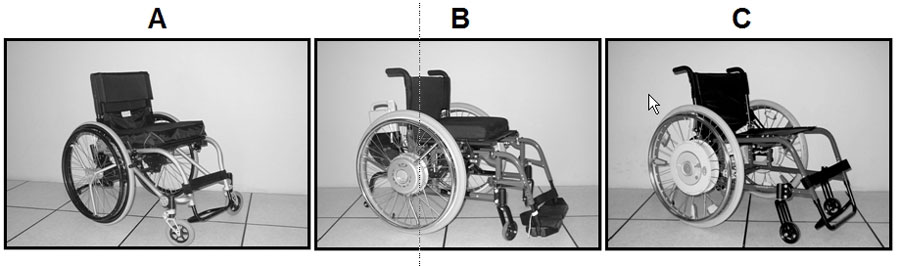 The subject propelled a standard manual WC (subject’s own Quickie 2) and three commercially available PAPAWs: i-GLIDE (Photo 2A), Xtender with a 1.5X power-assist (Photo 2B), and e.motion with the settings adjusted to mid sensitivity and power-assist (Photo 2C). The Xtender and e-motion were mounted on a Quickie 2 chair, similar to the subject’s own WC.