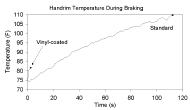 Handrims are the primary interface by which the wheelchair user pushes, brakes, and turns the wheelchair. The standard handrim is an anodized aluminum tubing hoop, mounted offset to the side of each wheel. The standard handrim is relatively slippery. As a result, the user must grip it tightly to keep the hand from slipping on the handrim during the push. A vinyl-coated handrim is a standard handrim coated with vinyl. The vinyl coating provides increased friction between the hand and the handrim. As a result, the user does not have to grip as hard during propulsion. Decreasing physical demand on the wheelchair user during propulsion is important since it may serve to delay or prevent the development of secondary repetitive stress injuries of the upper extremity. In a study of 9 wheelchair users pushing on a treadmill set to a range of grade conditions, we found the use of a vinyl-coated handrim resulted in an 8% average decrease in metabolic demand during propulsion [1]. The decrease in metabolic demand was hypothesized to be the result of reduced gripping demands as well as an increased mechanical efficiency of the push. In a pilot study of handrim biomechanics, Koontz et al. found that use of a vinyl-coated handrim on a wheelchair ergometer reduced the average peak force applied to the handrim during propulsion by 10% [2]. Unfortunately, the vinyl coating is a very poor conductor of heat. As a result, the heat generated during braking quickly exceeds the tolerance threshold of the user and the user has to let go of the handrim. In the same study of 9 wheelchair users, we found that when using a standard handrim, users could brake downhill on the treadmill for an average 109 seconds before letting go while they could only brake for 9 seconds using the vinyl-coated handrim [1]. Handrim surface temperature was also measured during the study. A handrim temperature profile for one subject is shown in Figure 1. It can be seen that the temperature climbs slowly for the standard handrim, while it rapidly heats up with the vinyl-coated handrim. Users let go at a lower temperature because the hand rather than the handrim is absorbing the heat. The use of gloves can allow a user to get down hills without burning his/her hands.