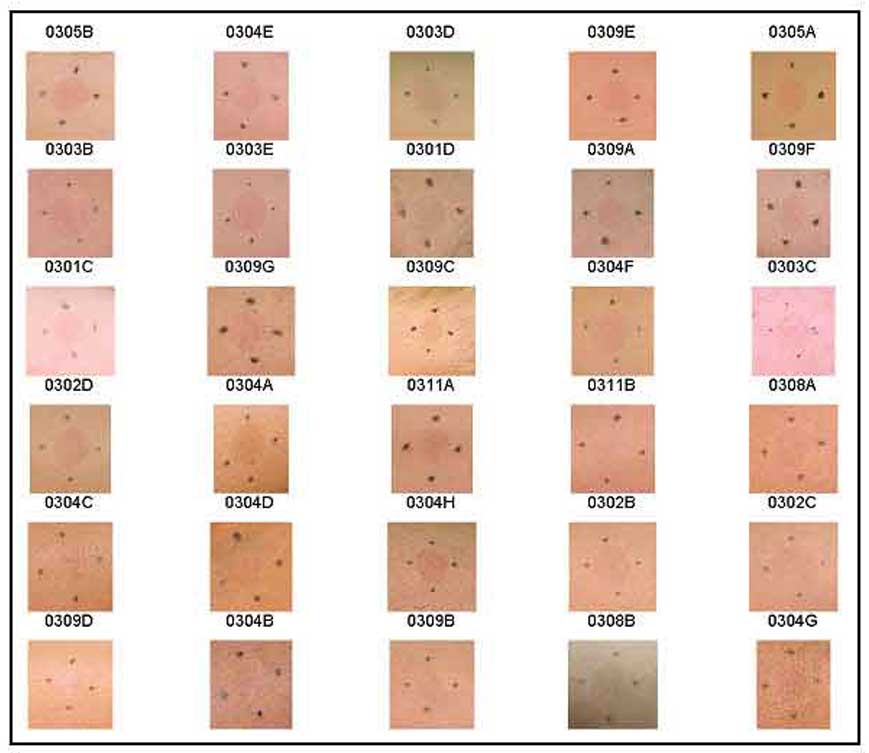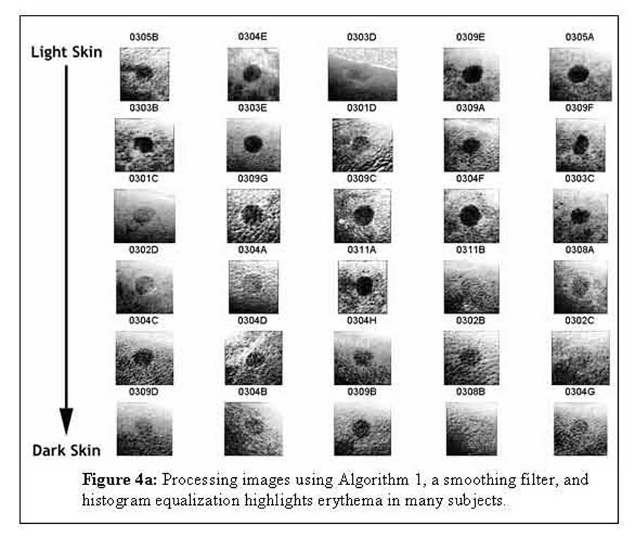 Figure 3 shows the color photographs of the erythema site. Figures 4 a and b illustrate the erythema site after processing with algorithms 1 and 2 respectively, filtering and equalizing the images. The erythema is more obvious in many of the processed pictures. For example, the erythema in dark-skinned Subjects 0309B and 0304C stands out greater when processed by either algorithm. Subject 0304G is improved more by Algorithm 1 while 0308A is helped more by Algorithm 2. Neither algorithm highlights the erythema sufficiently in Subject 0308B.