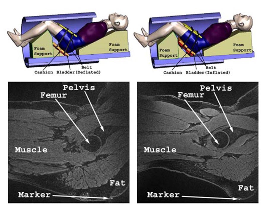 A healthy subject (male, 24 yr, 165 cm, 70 kg) was posed and loaded in the apparatus at a simulated sitting posture, i.e. with hip flexed at 80º and knee at 90º. MRI scan was performed with 2 loading conditions: “No Load” (Fig.1, Upper Left) and “Sitting Load” (Fig.1 Upper Right). Before the subject was transported into the MRI tube, the load was measured by a pressure mapping system to ensure that it was comparable to the recording from an actual upright sitting individual in a wheelchair. For comparing the images under two loading conditions, MRI sensitive markers were attached on the skin. Volumetric saggital MR images of the right buttock-thigh (576x576 matrix, 35 cm FOV, 288 slices, 0.6 mm thickness) were acquired (Fig. 1, Lower row) on a 1.5T scanner in the two loading conditions.