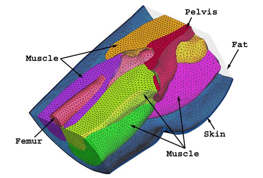 The MRI image sequence under “No Load” condition was segmented to reconstruct the geometry for pelvis, muscles, fat and skin. Based on the segmented surfaces, the FE mesh of the buttock-thigh was created for femur, pelvis, muscles, fat and skin with tetrahedral elements using HyperMesh. A total of 453,502 4-noded modified tetrahedral elements were created to mesh all structures (Fig. 2).