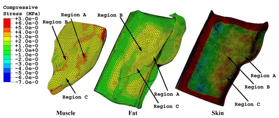 The results of the simulations showed that the internal compressive and shear stress distributions were substantially different among muscles, fat, and skin. The maximum compressive stress occurred in the muscle under IT (in Region A; Table 1 and Fig. 3), which is consistent with the experimental observation from other researchers (5). The compressive stress in fat layer was distributed relatively uniform, while in muscle and skin layers, the soft tissue under bony prominences bore substantially higher internal compressive stress (Table 1 and Fig. 3). The maximum shear stress occurred within muscle “Under IT” and skin “Under Femur”. The shear stress within muscle and skin were significantly higher than that in fat. This supports the conclusion that the shear stress is one of factors to form the PU’s in the skin by other researchers (6).
