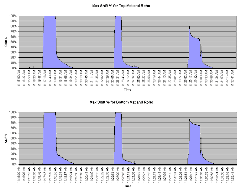 Comparisons of activity above and below the cushion were also performed for the MAM algorithm, which automatically applies a moving average adjustment to accommodate for posture changes and long-term changes in the sensors and cushion. The MAM measures activity as a shift percentage. The values are computed as the percentage of weight (relative to total weight) removed from either the left or right side of the cushion. Comparisons between MAM activity measurements above and below the cushion produced a maximum difference of 15% for the foam cushion and 20% for the Roho cushion. Graph 1 shows a comparison of activity above and below the Roho cushion using the MAM algorithm.