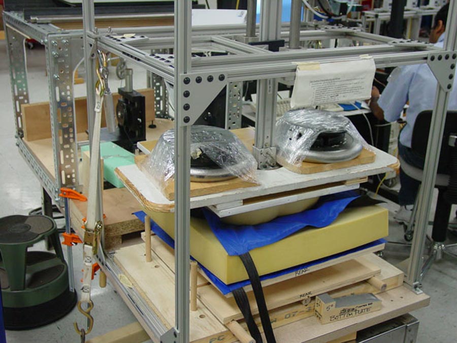 To accurately control seat pressure, an indenter buttocks model from the Georgia Tech Center for Assistive Technology & Environmental Access (CATEA) was utilized. The indenter that was available was not capable of being shifted while engaged with the seating surface. Therefore, an adjustable platform was created by CATEA staff to allow the cushion to be shifted underneath the indenter in a controlled manner (see photo 1). This method of facilitating controlled shift events was primarily driven by the constraints of the available indenter. This method is effective at simulating seat activities such as major weight shift events with different types of cushions. However, shifting the seat surface rather than the indenter is not appropriate for gel cushions due to the effects of gravity on the gel fluid.