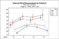 The longitudinal analysis for a single patient over a period of 4 time points (Figure 1) show an increase in muscle size post-implantation. The Tukey’s comparison test showed that the difference in longitudinal measurements of right sacral area and the left and right pelvic area were significant only when compared to time 0 (p<0.05). After month 6 differences were not significant except for the left sacral area. (Figure 2)
