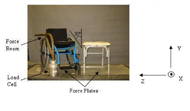 Figure 3. Representative self selected transfer recording of vertical forces of the force sensing beam and the force platform (bench force) to determine transfer from wheelchair to bench. (Click for larger view)